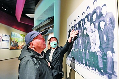 浙江诸暨枫桥镇魏廉村一名老党员(左)在枫桥经验陈列馆参观。新华社发