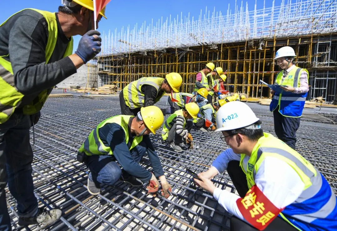 2021年4月16日,一场劳动技能竞赛在乌鲁木齐机场改扩建工程现场举行,参赛工人大显身手比拼技能,比赛现场热火朝天。图为施工人员参加钢筋绑扎比赛。 新华社记者 王菲/摄