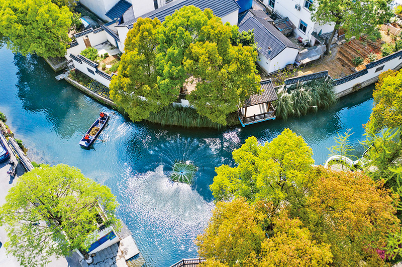 2005年8月15日,在浙江省安吉县天荒坪镇余村,时任浙江省委书记的习近平同志提出重要论断——绿水青山就是金山银山。绿水青山就是金山银山理念指引中国经济社会绿色变革,已成为全社会的共识和行动。图为2020年4月9日,在浙江省长兴县龙山街道渚山村,保洁人员进行日常河道护理巡查(无人机照片)。 新华社记者 徐昱/摄