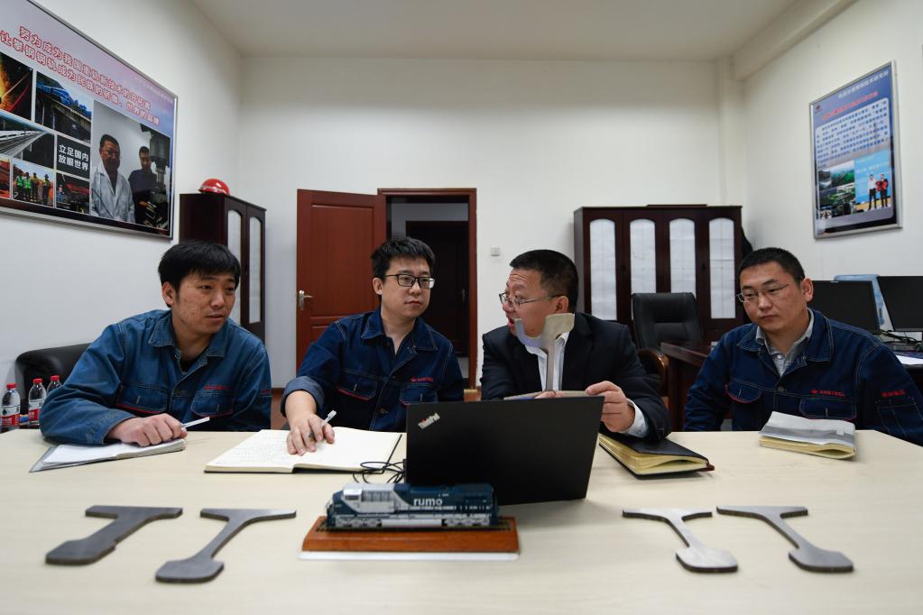 全国人大代表邹明(右二)与同事一起讨论道岔设计方案。胥冰洁摄