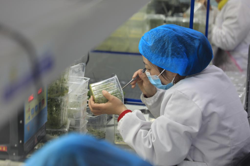 3月2日,在定西市渭源县五竹马铃薯良种繁育专业合作社,工作人员正在进行马铃薯脱毒苗切段繁育。新华社记者张智敏 摄