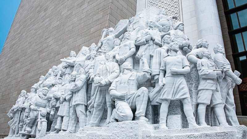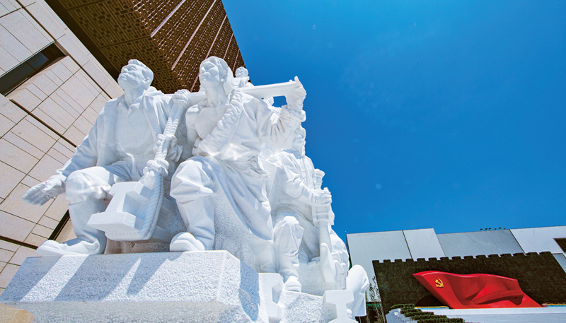 中国共产党历史展览馆西侧广场上矗立的《信仰》、《伟业》、《攻坚》、《追梦》四组大型雕塑,分别对应“四个伟大”主题,276个人物与583块汉白玉融为一体,讲述着中国共产党100年来为人民谋幸福、为民族谋复兴的奋斗历程。雕塑《信仰》中71位不同时代、不同身份、不同年龄的代表人物庄严宣誓的场景,集中展现了中国共产党人不忘初心、披荆斩棘、继往开来,团结带领全国各族人民朝着实现中华民族伟大复兴坚毅前行的豪情壮志。 刘新武/摄