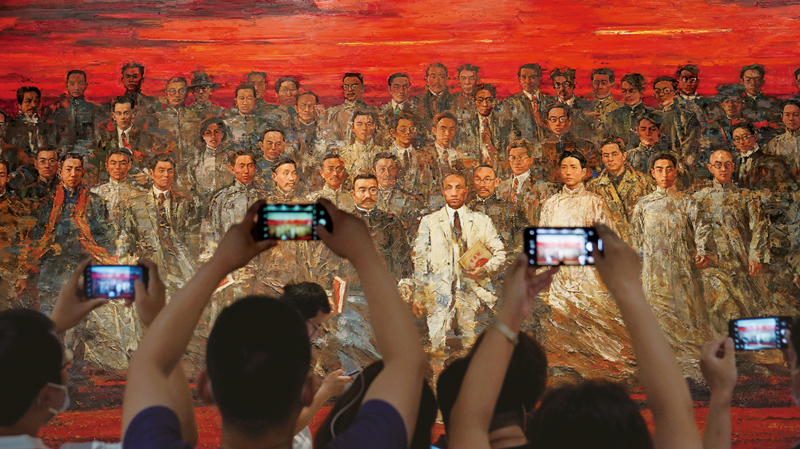 如今,在中共一大纪念馆,高3米、宽7米的巨幅油画《星火》吸引着参观者驻足。画面上,各地共产党早期组织的50余名成员昂首阔步,意气风发。