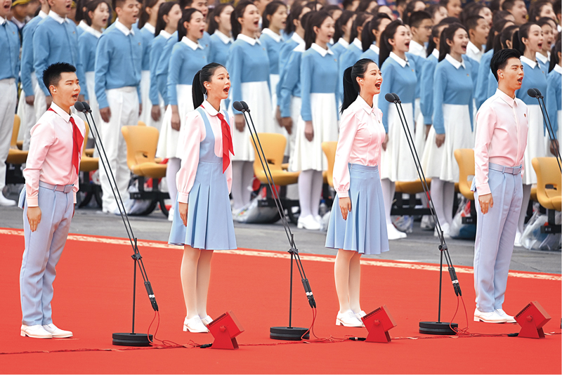 2021年7月1日上午,庆祝中国共产党成立100周年大会在北京天安门广场隆重举行。这是共青团员和少先队员代表集体致献词。 新华社记者 李尕/摄