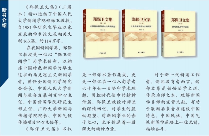 《郑保卫文集》(三卷本)是郑保卫教授多年文章的结集,是他学术生涯的系统总结。这部文集为中国特色新闻学建设提供了重要的理论参照和学术研究资源。文集中所收录的论文、评论和演讲,不仅记录了他个人对中国特色新闻学和党的新闻工作的深刻思考,也从一个方面勾勒出改革开放以来中国新闻学在学科建设、理论创新与话语建构中的发展脉络。作为同时代的亲历者,我深感这部文集不仅具有造诣甚高的学术价值,而且对进一步研究新闻思想与学科建设具有重要的意义。