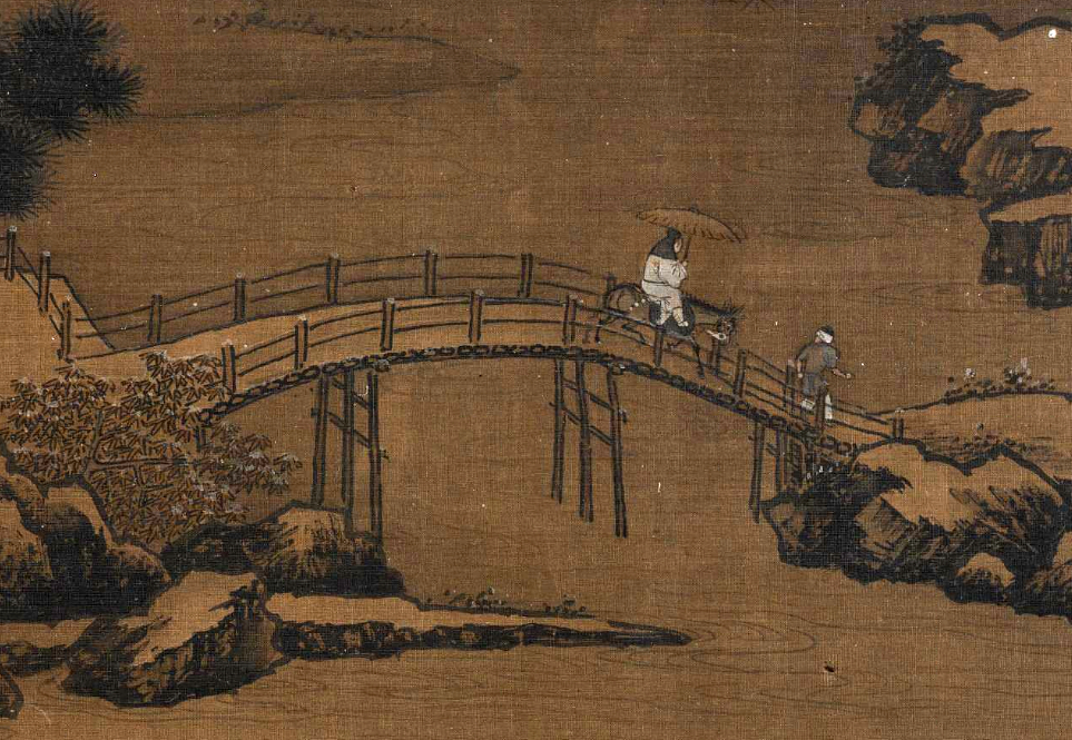 近景巨石横卧,灌木丛生,画面中部石上三株巨松拔起,松身互相遮掩,折落而上,姿态敧侧,枝叶扶疏、招展,或偃卧,或倒悬,枝上隐约有一线积雪未化,松下房舍隐现。若说寒林积雪是画面的躯干,那么其中的人物活动便是其灵魂。画中木拱桥横跨两岸,桥上一人白衣撑伞骑驴瑟缩而行,有一侍仆前导,似在叮嘱主人小心,充满关心。