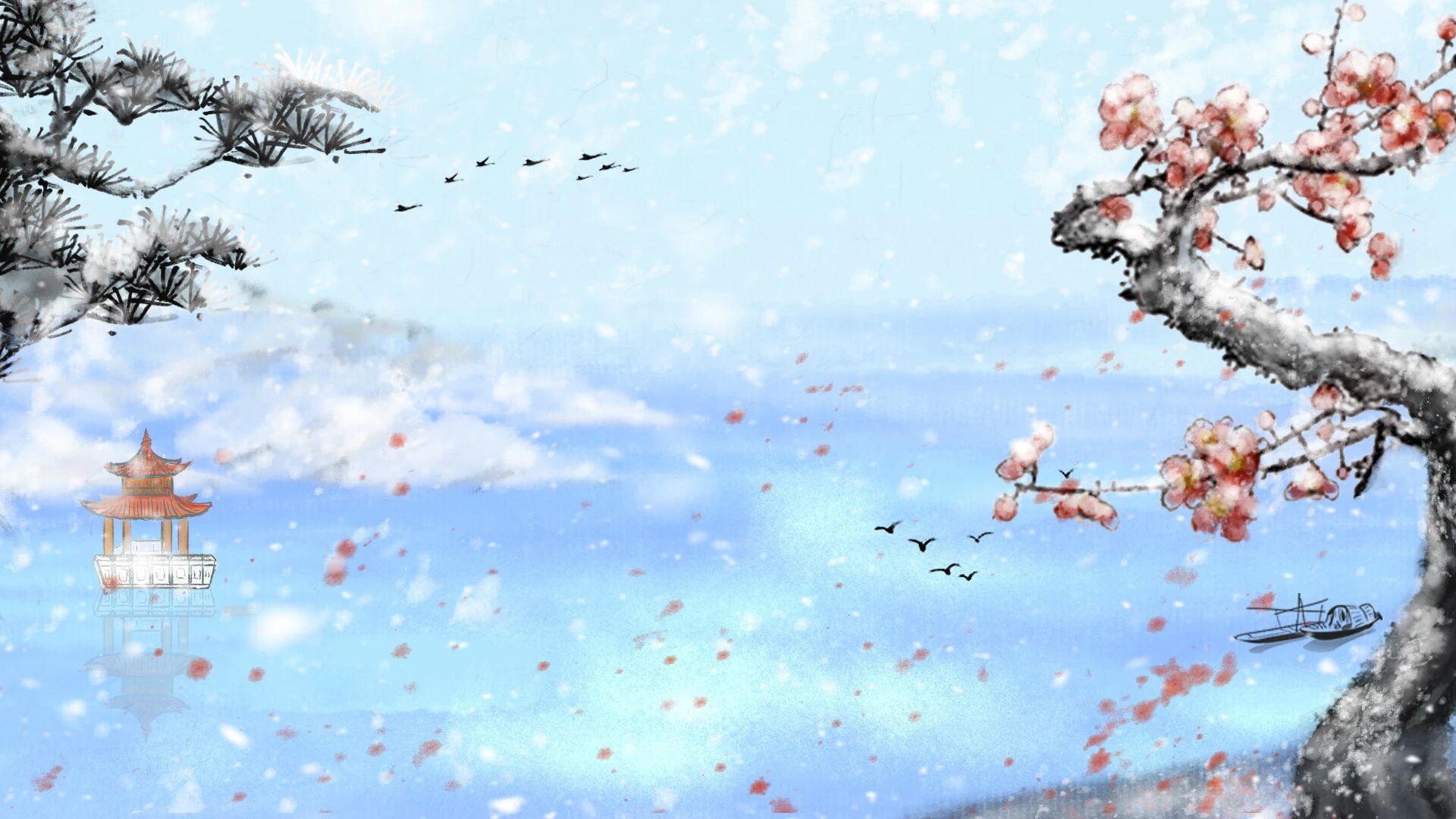 “千山鸟飞绝,万径人踪灭。孤舟蓑笠翁,独钓寒江雪。”柳宗元的《江雪》堪称大雪意境的千古绝唱。诗人以极简笔墨勾勒出天地苍茫的雪景:群山失翠,飞鸟匿迹,千条路径不见人踪,唯有一叶孤舟、一位蓑笠翁静坐寒江垂钓。那在严寒中坚守的渔翁,是孤独清高气节的象征,更是诗人自己的写照。这首诗表达了诗人在困境中孤独寂寞、不屈不挠的心境,同时也展现了他对自由和理想的追求。