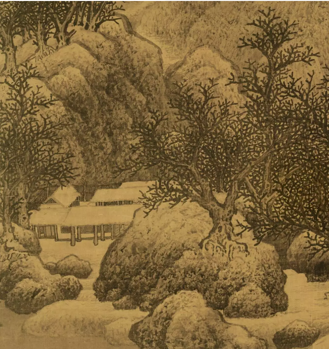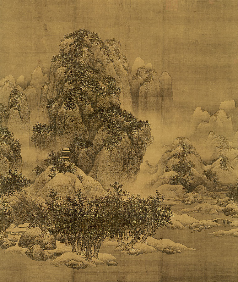画中表现寒冬中雪山寒林之景,崇山峻岭,山势高耸,白雪皑皑。山脚溪水清洌,水面平静,坡上树木挺立,数座楼宇掩映其中,白雪盖顶,山之巍峨、雪之洁白,林之苍翠,体现出寒冬中静谧、寒寂之意境。绘者把大气纵横的群山浩景浓缩于方寸画纸之上,幽静深邃的意境令人心生“五月天山雪,无花只有寒”的冷清,同时又有一份“深林人不知,明月来相照”的独乐。这并不是简单的风景描绘,而是古人“天人合一”哲学观的视觉呈现,体现了人在浩瀚自然与凛冽大雪面前的敬畏与沉思。