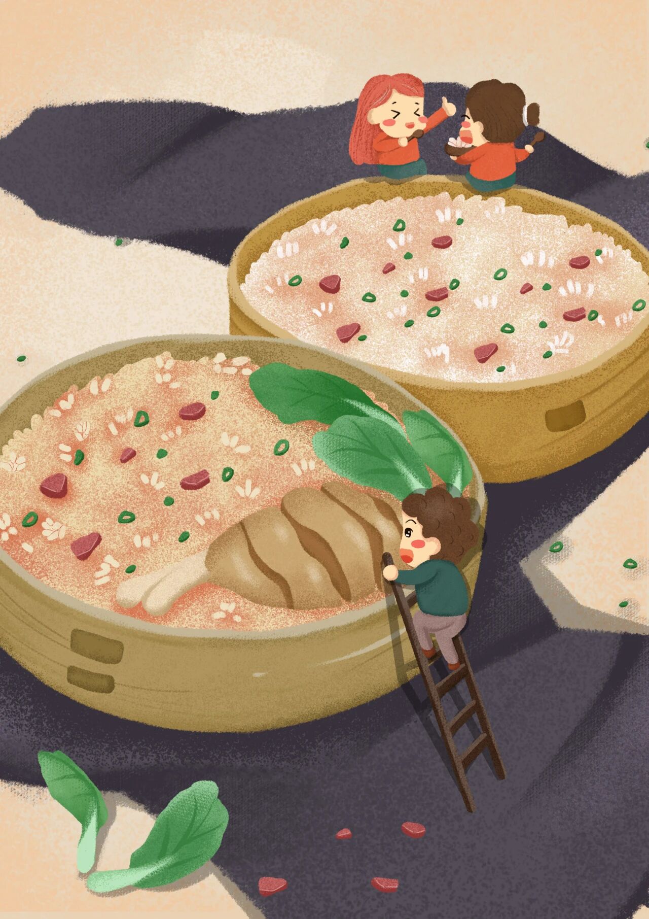 岭南民谚有云:“小寒大寒,无风自寒。”在大寒节气这一天,广东民间有吃糯米饭的习俗。旧时防寒条件简陋,没有更多营养品食用,从大寒开始吃上一碗糯米饭就算是补身体了。中医认为,糯米性温、味甘,入肺、脾经,有补虚、补血、健脾暖胃作用,是一种温和的滋补品。如今在广东地区,家家户户也会煮上一锅香喷喷的糯米饭,拌入“腊味”、虾米、干鱿鱼、冬菇等,以迎接大寒节气的到来。