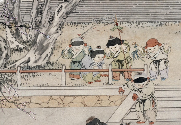 十名孩童来到结冰的池塘边嬉戏:五名胆大的孩童先下到了冰面上,其中两名孩童因冰面湿滑仰面摔倒,姿态各异,有的试图挣扎起身,有的尚处于跌倒的瞬间,另外三名孩童正从不同方向滑向跌倒的同伴;岸边上,五名孩童或倚石观望,或拍手嬉笑,跃跃欲试,生动呈现了冬日里孩童玩耍的场景。