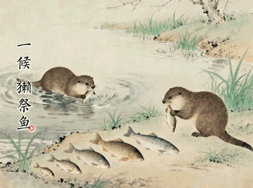 释义:獭,又叫水狗,是捕猎鱼类的动物。祭鱼,是指捕鱼来祭祀上天。豺和獭皆懂得回报根本,初春时节鱼儿开始向上游动,水獭见水中鱼儿多了起来,于是先捕获一批之后放于岸上,随后慢慢享用,好像捕鱼来祭祀一般。
