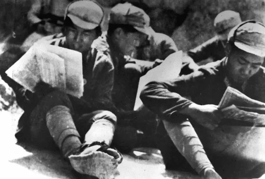 ▲中国人民抗日军政大学的学员在学习整风文件