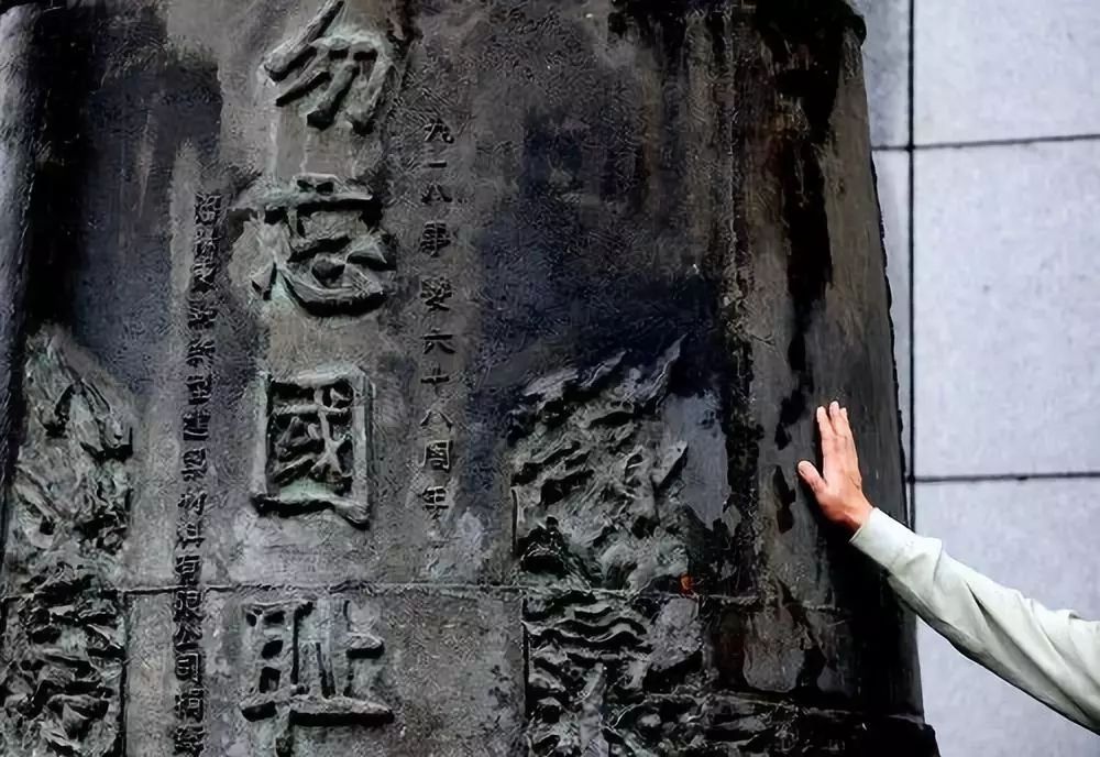 ▲参观者在沈阳的“九一八”历史博物馆内抚摸“勿忘国耻”警世钟。