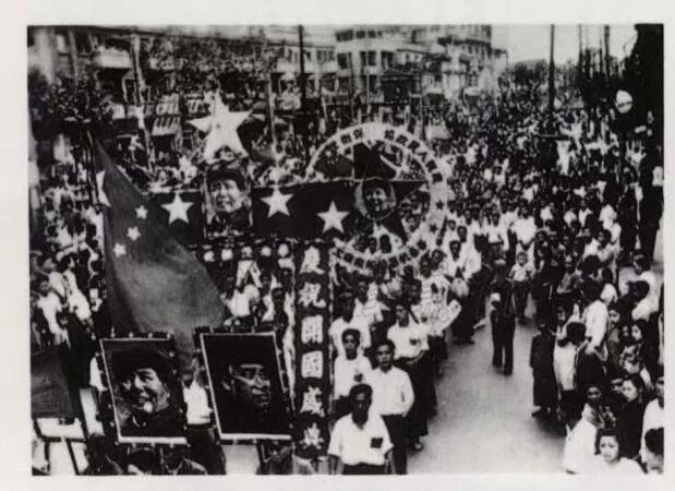 阅兵式结束后,群众游行将庆典推向新的高潮。游行队伍高举红旗,纵情欢呼。“中国共产党万岁!”“中华人民共和国万岁!”“毛主席万岁!”天安门城楼上的扩音器里,不断传出毛泽东主席“同志们万岁!”的回应声。这是值得载入史册的光辉时刻。虽然庆祝活动在晚上9时许结束,但欢乐的人群仍久久不愿离去。无数群众手持红灯继续游行,远望如一条游动的火龙,与夜空中绽放的礼花交相辉映。