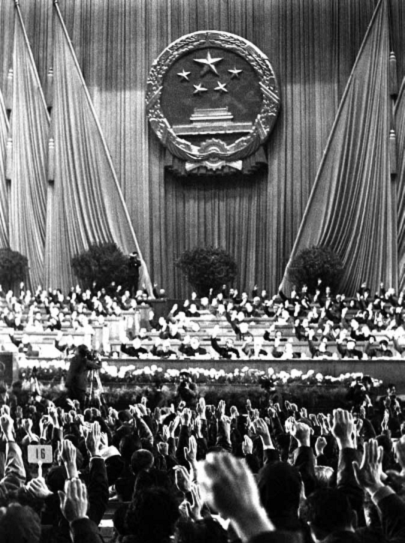 ▲1982年12月4日,北京人民大会堂,出席五届全国人大五次会议的代表们举手表决通过中华人民共和国新宪法。