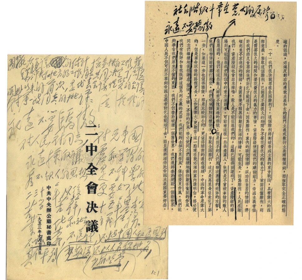 ▲1953年7月,毛泽东在重印的《二中全会决议》上作批示强调,“不作寿、不送礼、少敬酒、少拍些掌、不以人名称地名、不把中国人和马恩列斯平列”“六条规定”。