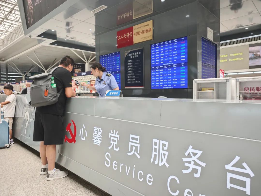 ▲郑州东站设立党员服务台。图为旅客在服务台前咨询乘车事宜